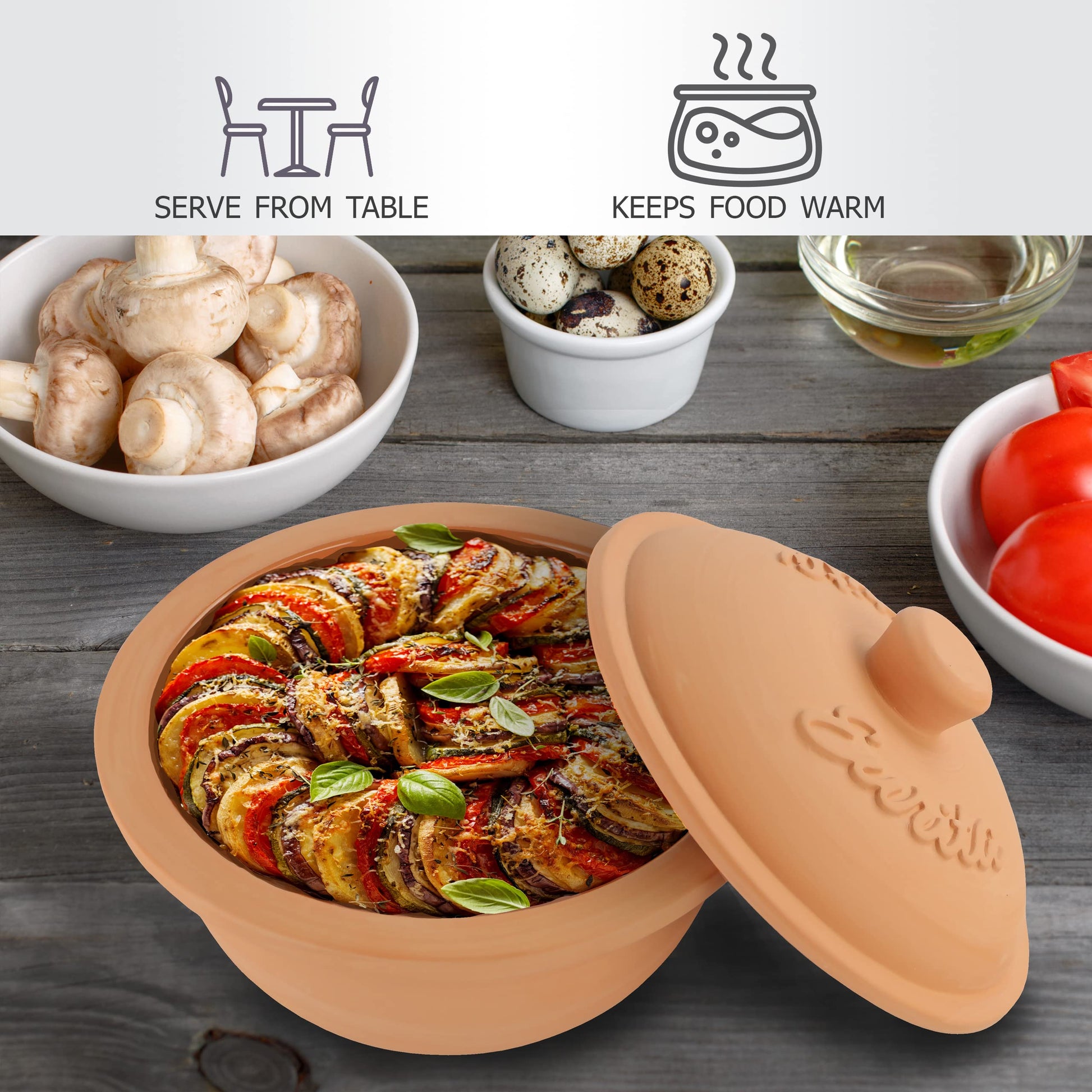 Enhance your cooking with the Reston Lloyd Eurita Clay Roaster, made from all-natural clay material that contains no lead, cadmium, or fillers. Tested for safety in Europe and the USA, this roaster features an unglazed lid that is soaked before use. During cooking, the water evaporates to create a blanket of steam, ensuring your food is tender and infused with natural flavors.