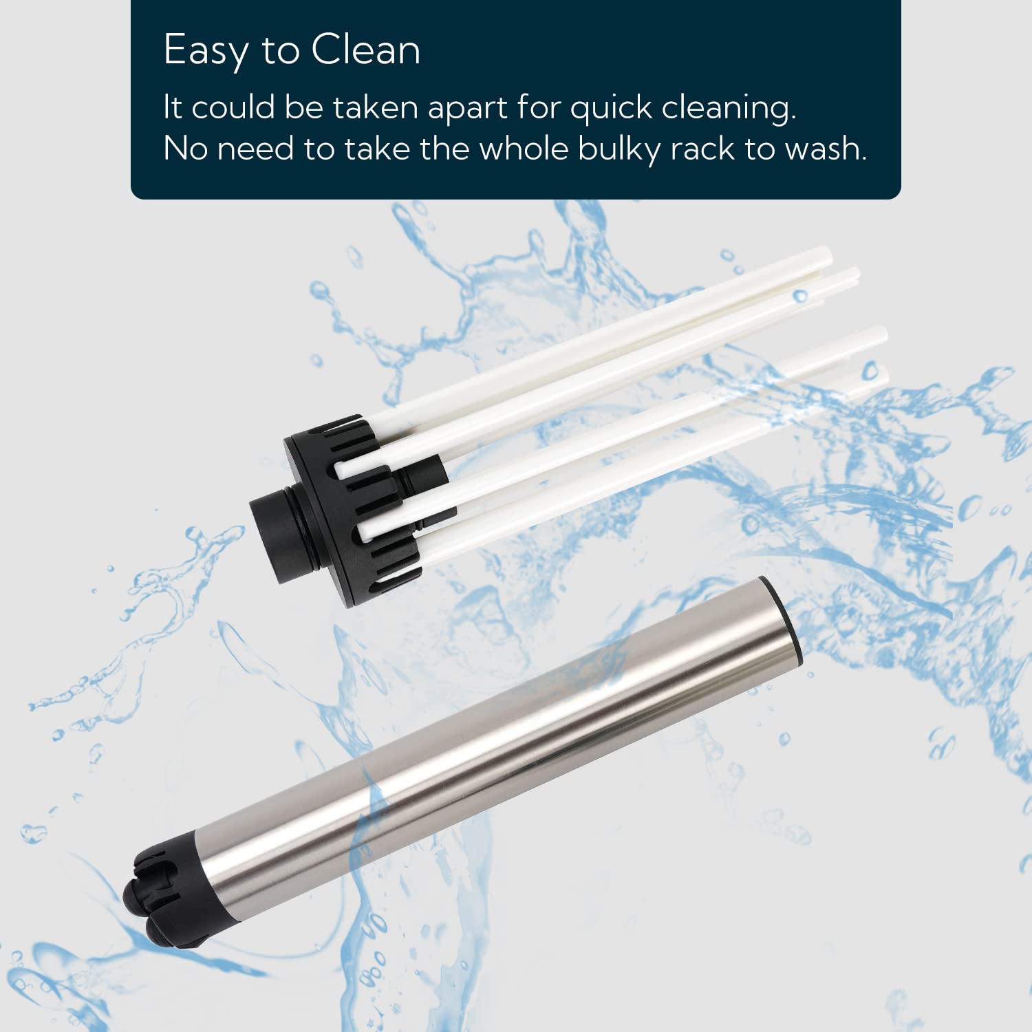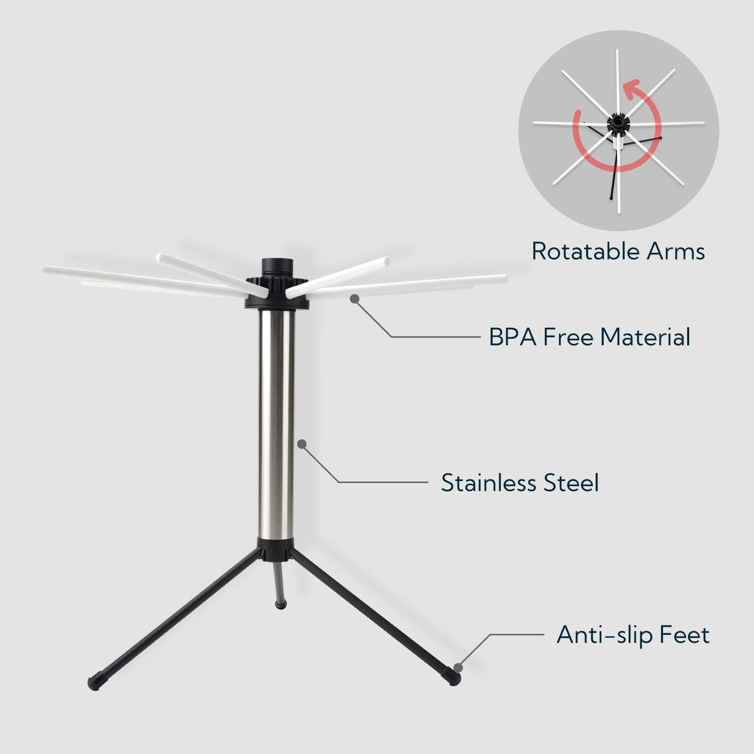Setting up the rack takes just 15 seconds, thanks to its user-friendly design. The rotatable arms make it easy to hang your pasta, ensuring even drying. The arms are detachable for quick and easy cleaning, and the rack is made from premium stainless steel with food-grade BPA-free plastic, ensuring durability and safety. Silicone feet keep the rack steady and protect your counter from scratches.
