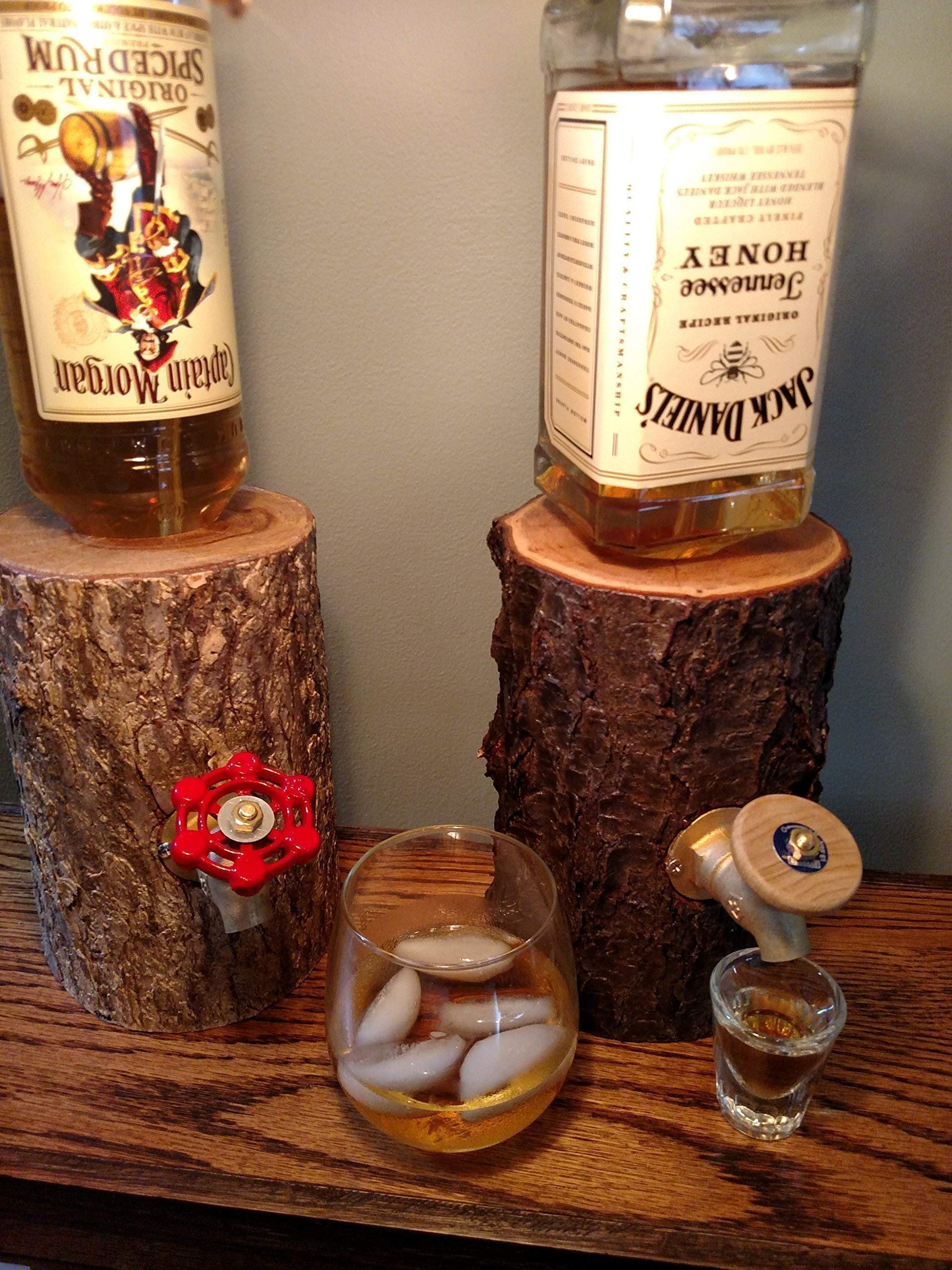 The dispenser features a lead-free brass spout and food and beverage-safe materials to ensure your liquor remains pure. The new and improved design allows for better sealing and accommodates almost every type of liquor bottle. The dispenser can be easily moved to the edge of the bar for convenient pouring into tall glassware. Add a touch of rustic charm to your bar with this functional and stylish log liquor dispenser.